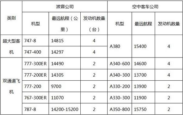 根據(jù)波音公司和空中客車公司公布的數(shù)據(jù),其主要寬體機型的航程數(shù)據(jù)如下: