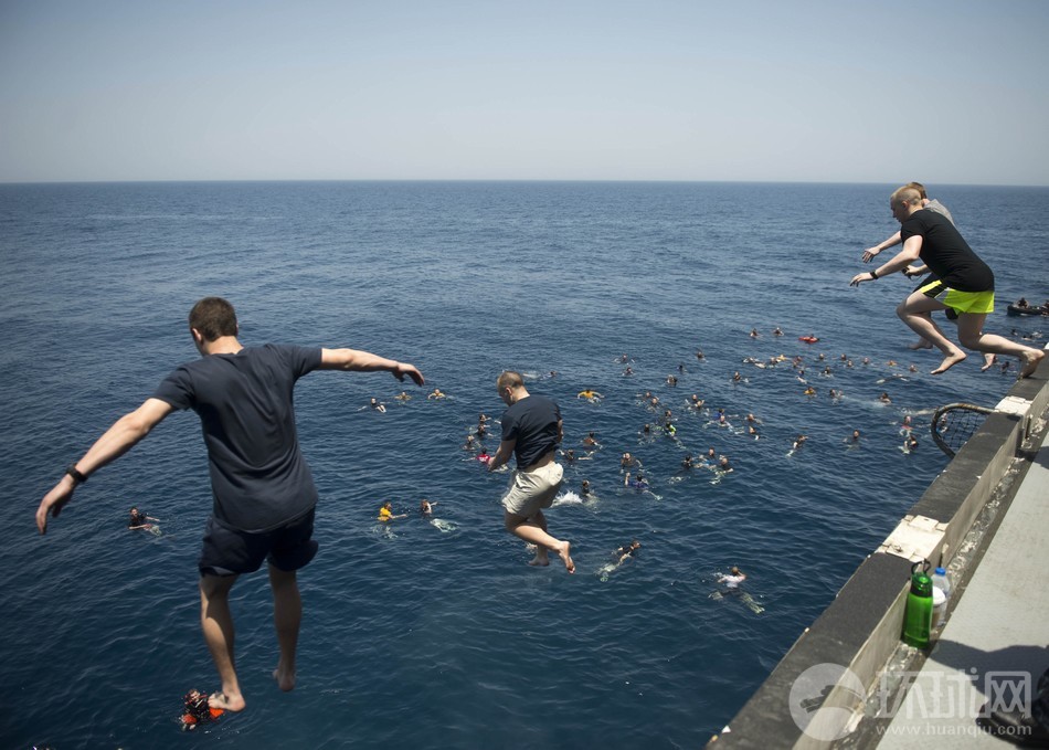 據(jù)美國海軍網(wǎng)報道,當(dāng)?shù)貢r間5月12日,正在阿拉伯海北部執(zhí)行部署任務(wù)的美國海軍尼米茲級航空母艦艾森豪威爾號(CVN 69)組織艦員進行跳水游泳訓(xùn)練。這不僅僅是一項休閑娛樂活動,也是訓(xùn)練艦員在緊急情況下的跳水逃生能力。