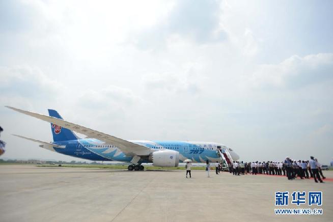 6月2日,南方航空公司在廣州白云機(jī)場(chǎng)舉辦接機(jī)儀式,宣布中國(guó)引進(jìn)的首架波音787夢(mèng)想飛機(jī)正式啟動(dòng)運(yùn)營(yíng)。當(dāng)日,我國(guó)引進(jìn)的首架波音787夢(mèng)想飛機(jī)飛抵廣州。 新華社記者 王建華 攝