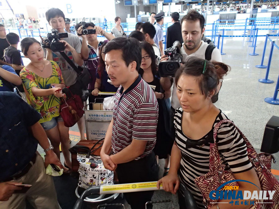 7月8日,在韓亞航空舊金山墜機(jī)事故中罹難的中國乘客王琳佳的父親(中)和母親(右)在上海浦東機(jī)場等候辦理乘機(jī)手續(xù)。(高爾強(qiáng) 攝)