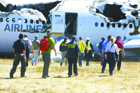 美國國家運(yùn)輸安全委員會(huì)調(diào)查人員在事故現(xiàn)場(chǎng)檢查飛機(jī)殘骸。