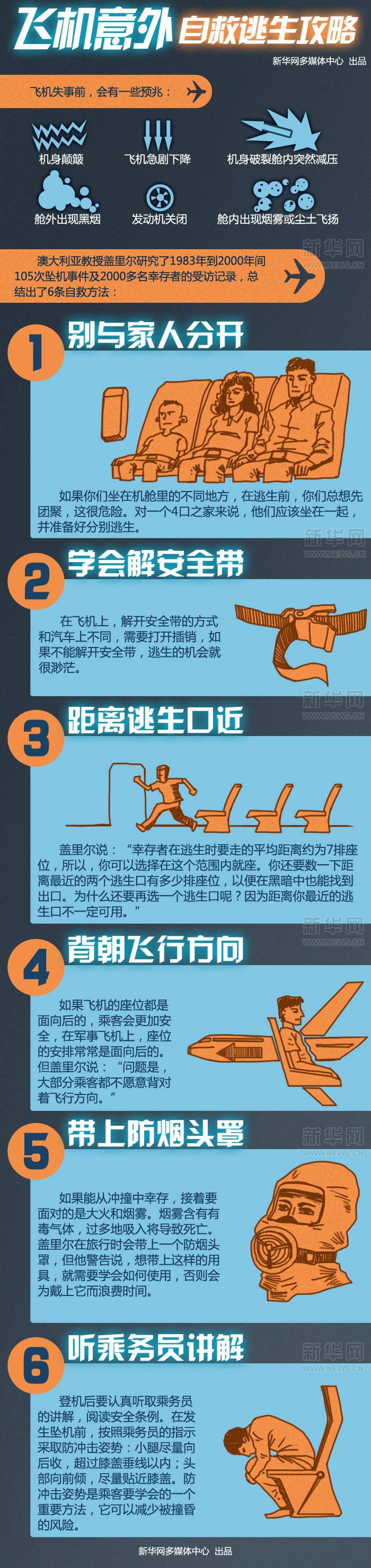 澳大利亞教授蓋里爾研究了1983年到2000年間105次墜機(jī)事件、2000多名幸存者的受訪記錄,總結(jié)出6條自救方法。