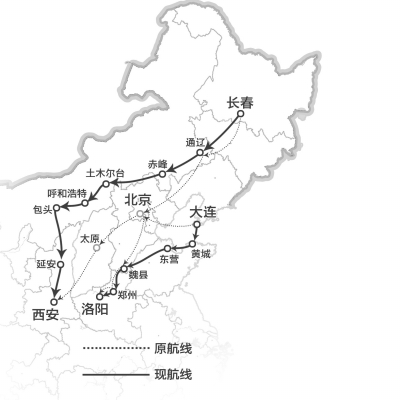 具體方案為:上述航線均繞開(kāi)北京上空,其中3條向西的航線飛經(jīng)內(nèi)蒙古的土木爾臺(tái)、呼和浩特、包頭抵達(dá)西北、西南地區(qū);4條向南的航線飛經(jīng)大連、青島抵達(dá)中南地區(qū)。比如,原大連—北京—魏縣—鄭州/洛陽(yáng)航線調(diào)整為大連—黃城—東營(yíng)—魏縣—鄭州/洛陽(yáng)(注:中間僅為航班經(jīng)過(guò)地點(diǎn)不停。)。