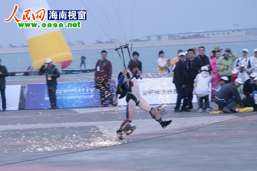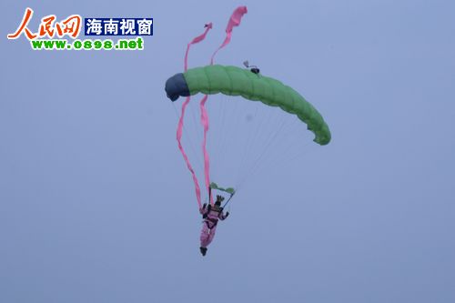 17日上午,2011環(huán)海南飛行拉力賽在?谂e行了隆重的開幕儀式。直升機(jī)同心圓旋轉(zhuǎn)、模型機(jī)超低空飛行、跳傘隊(duì)上演“七仙女下凡”……八一跳傘隊(duì)、河南跳傘隊(duì)、翱翔中國航空模型特技飛行表演隊(duì)等在萬綠園旁人工島上演了一場華麗的飛行表演秀,一系列超乎想象的精彩表演讓現(xiàn)場觀眾嘆為觀止。