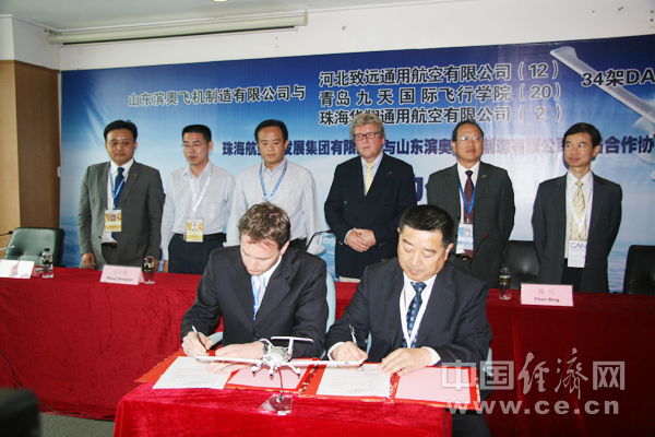 中國經(jīng)濟(jì)網(wǎng)珠海航展特派記者團(tuán) 記者王飛 11月16日?qǐng)?bào)道 15日,山東濱奧飛機(jī)制造有限公司在珠海航展上分別與河北致遠(yuǎn)通用航空有限公司、青島九天國際飛行學(xué)院、珠海華翔通用航空有限公司簽署總共銷售34架DA40飛機(jī)購機(jī)合同定單,并同時(shí)與珠海航空城簽署戰(zhàn)略合作協(xié)議。