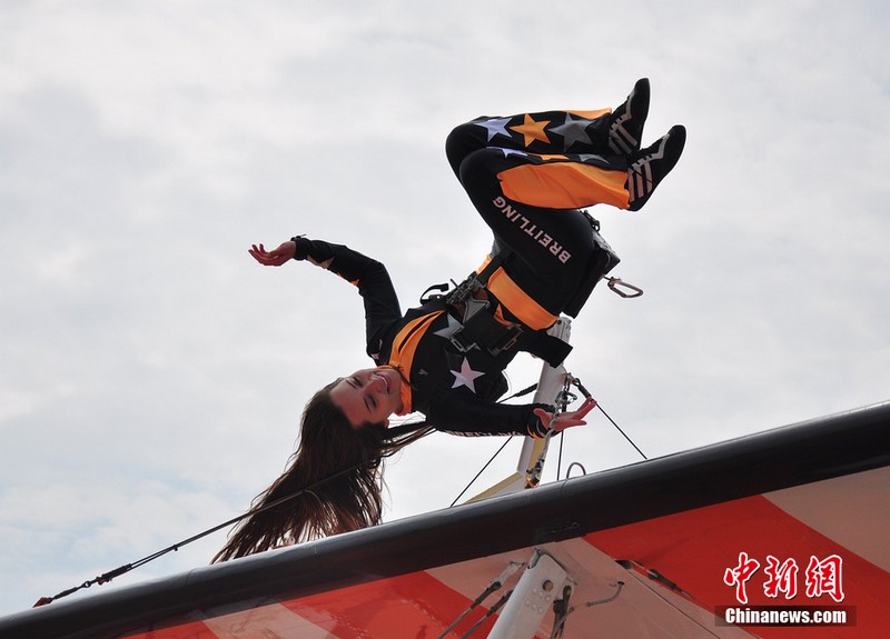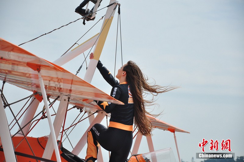 11月11日,歐洲“百年靈”機翼行走飛行表演隊的美女表演者在地面停放的飛機上進行了表演動作展示。