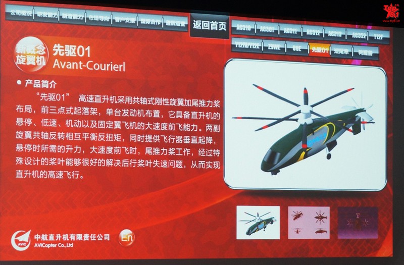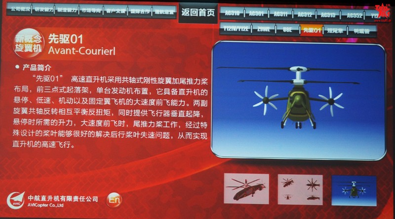 人民網(wǎng)北京11月9日電 (記者 楊鐵虎)中航工業(yè)直升機公司將在第九屆中國航展上展出“先驅(qū)01”新概念高速直升機模型。9日下午,中航工業(yè)直升機公司的專家向人民網(wǎng)記者介紹說,“先驅(qū) 01”新概念高速直升機采用共軸式剛性旋翼加尾推力槳布局,前三點式起落架,單臺發(fā)動機布置。具備直升機的懸停、低速、機動以及固定翼飛機的大速度前飛能力。