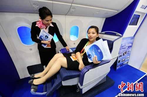 5月29日,日本全日空航空公司(ANA)在首屆中國(guó)(北京)國(guó)際服務(wù)貿(mào)易交易會(huì)(“京交會(huì)”)上展示該公司訂購(gòu)的全球首架波音787“夢(mèng)想客機(jī)”的模擬客艙,參觀者可以親身體驗(yàn)舒適的座椅。(圖:侯宇攝)