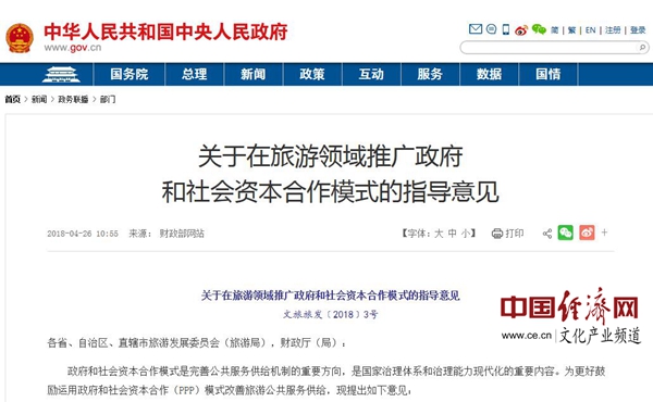 經(jīng)濟日報-中國經(jīng)濟網(wǎng)北京5月7日訊 近日,文化和旅游部、財政部日前聯(lián)合印發(fā)了《關(guān)于在旅游領(lǐng)域推廣政府和社會資本合作模式的指導(dǎo)意見》,就調(diào)動更多社會資源參與旅游業(yè)發(fā)展,探索推廣旅游PPP實施路徑、發(fā)展模式及長效機制,提高旅游投資有效性和公共資源使用效益,建設(shè)一批旅游PPP示范項目作出全面部署。以下為意見全文: