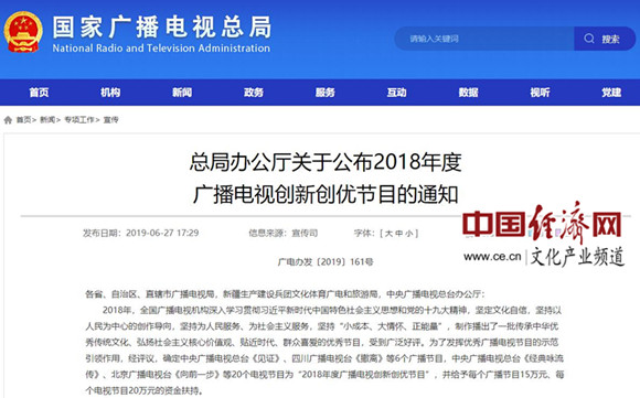 國家廣播電視總局辦公廳關(guān)于公布2018年度廣播電視創(chuàng)新創(chuàng)優(yōu)節(jié)目的通知