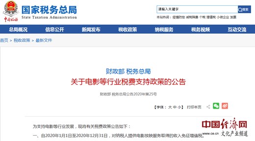 經(jīng)濟(jì)日?qǐng)?bào)-中國經(jīng)濟(jì)網(wǎng)北京5月20日訊 近日,國家稅務(wù)總局官網(wǎng)發(fā)布《關(guān)于電影等行業(yè)稅費(fèi)支持政策的公告》(以下簡稱《公告》),支持電影等行業(yè)發(fā)展。