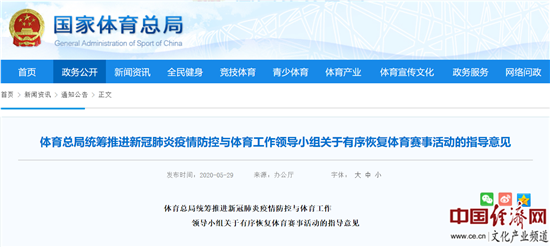 經(jīng)濟(jì)日?qǐng)?bào)-中國經(jīng)濟(jì)網(wǎng)北京6月3日訊 近日,國家體育總局發(fā)布了《體育總局統(tǒng)籌推進(jìn)新冠肺炎疫情防控與體育工作領(lǐng)導(dǎo)小組關(guān)于有序恢復(fù)體育賽事活動(dòng)的指導(dǎo)意見》(以下簡(jiǎn)稱“意見”),意見指出,采取預(yù)約、限流等方式,有序開放各類運(yùn)動(dòng)場(chǎng)所。 >>>更多政策可查看中國經(jīng)濟(jì)網(wǎng)“中國文化產(chǎn)業(yè)政策庫”