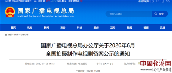 經(jīng)濟日報-中國經(jīng)濟網(wǎng)北京7月7日訊 7月6日,國家廣播電視總局公布了6月份全國電視劇拍攝制作備案公示情況,據(jù)悉,6月份全國電視劇拍攝制作備案公示的劇目共61部、2019集。