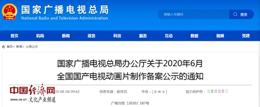 經(jīng)濟(jì)日報-中國經(jīng)濟(jì)網(wǎng)北京8月5日訊 中國經(jīng)濟(jì)網(wǎng)文化產(chǎn)業(yè)頻道記者從國家廣播電視總局官網(wǎng)獲悉,《國家廣播電視總局辦公廳關(guān)于2020年6月全國國產(chǎn)電視動畫片制作備案公示的通知》(簡稱《通知》)于4日發(fā)布。《通知》明確,2020年6月,經(jīng)備案公示的全國國產(chǎn)電視動畫片為53部,19934分鐘。