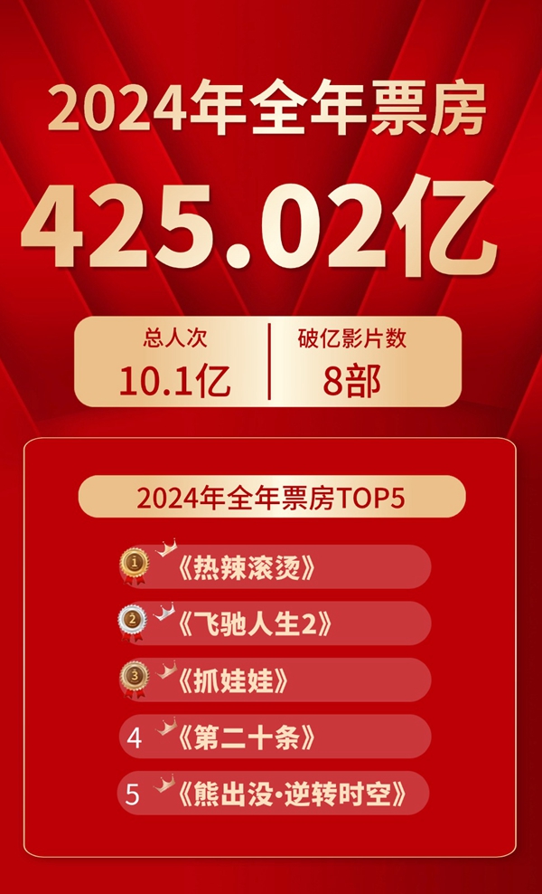 425.02億 !2024年全國(guó)電影票房公布 8部影片破10億