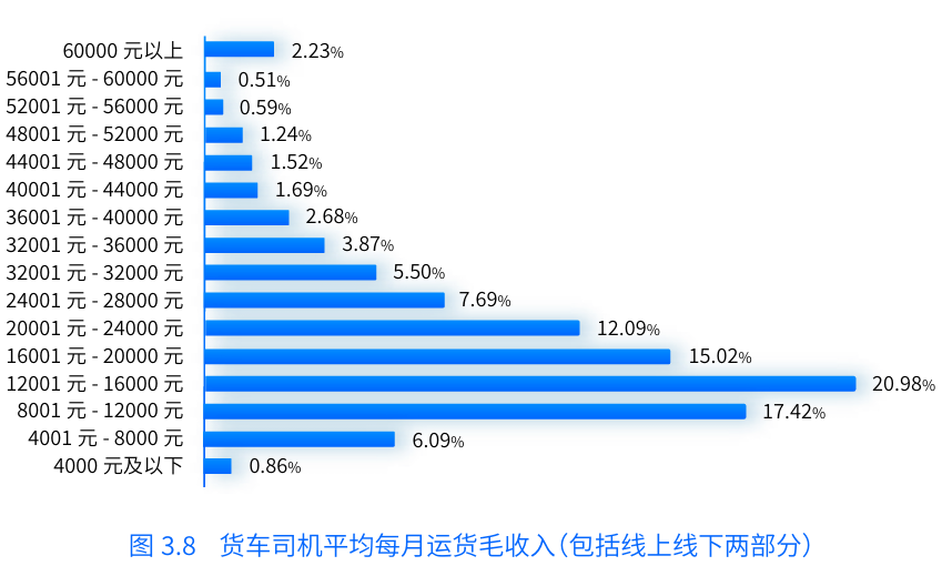 報告中提到,貨車司機每月毛收入平均值為20441元。在剔除油(電、氣)費、高速費、保險、保養(yǎng)和平臺信息技術服務費等成本后,貨車司機平均月凈收入均值為12063元。