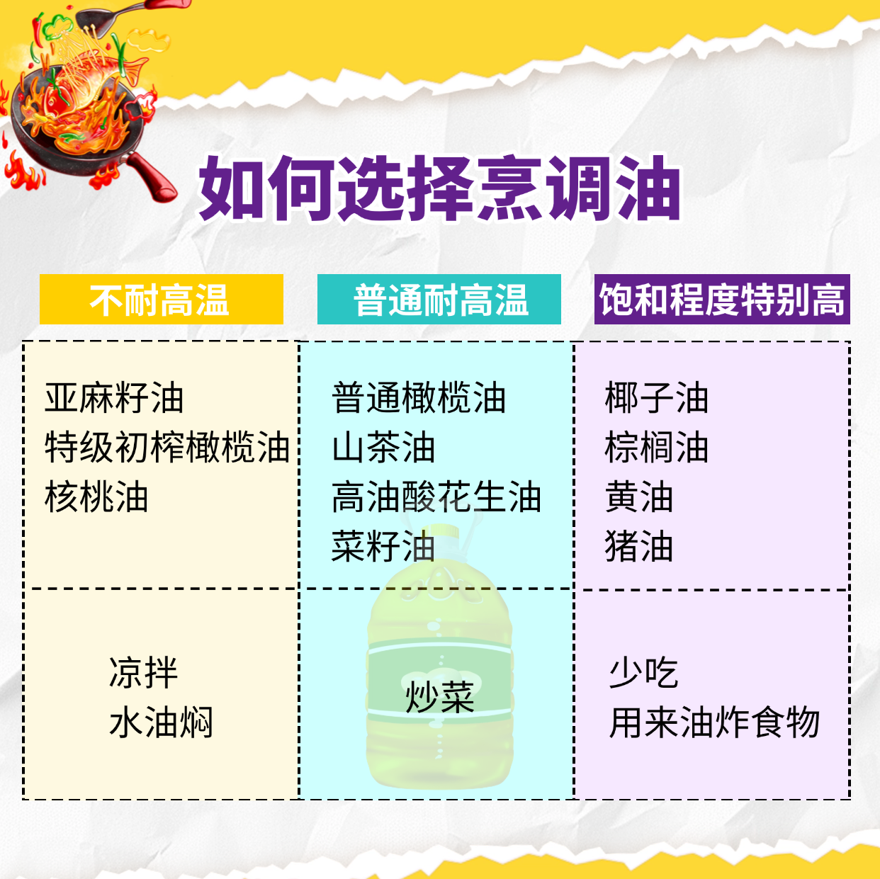 市面上的烹調(diào)油多種多樣,該如何選擇?曹展表示,不耐高溫的烹調(diào)油,如亞麻籽油、特級初榨橄欖油、核桃油等,可以用來涼拌、水油燜;普通耐高溫的烹調(diào)油,如普通橄欖油、山茶油、高油酸花生油、菜籽油等,可以用來炒菜;飽和程度特別高的烹調(diào)油,如椰子油、棕櫚油、黃油、豬油等,首先要少吃,如果有需要,可以偶爾用來油炸食物。