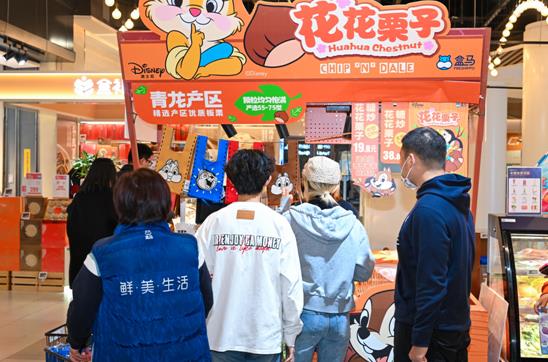 在哈一口氣便能凝結(jié)出霧的寒冬,暖呼呼的糖炒栗子最能溫暖人心。在午后的盒馬線下門店,糖炒栗子的檔口已經(jīng)排起了長隊(duì),工作人員將剛炒制出來的新鮮栗子裝進(jìn)了印有迪士尼人物奇奇蒂蒂形象的紙盒里,遞給消費(fèi)者?!疤鹛鹋磁吹睦踝?,最適合當(dāng)冬天小零食”、“沖著這個(gè)包裝來買的,太可愛了?!?/p>
