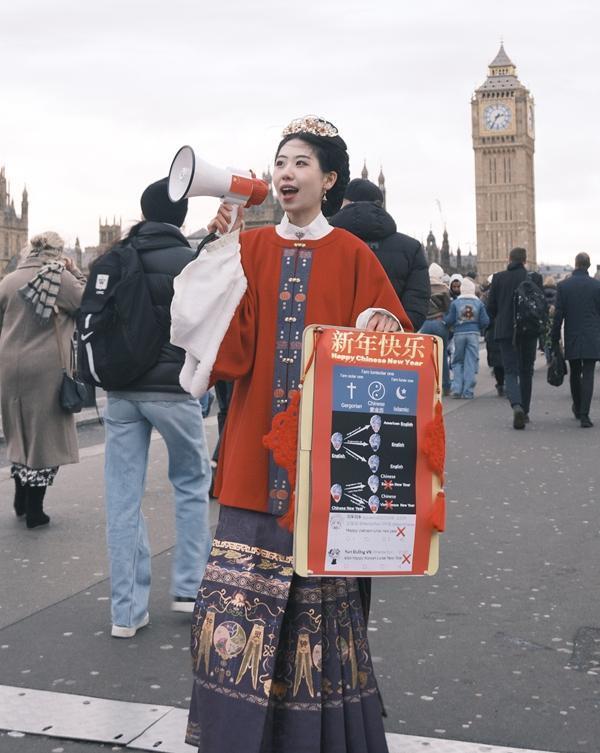江西女生曹夢竹畢業(yè)于愛丁堡大學(xué),在碩士入學(xué)前,她正在度過自己的間隔年,在社交媒體上分享著留學(xué)生活的點滴日常。得知申遺成功的消息,她從攝影師朋友那里借來一身紅色的明制漢服,帶著擴音器、媽媽編織的中國結(jié)和春節(jié)文化的宣傳板,來到人山人海的倫敦眼、大本鐘下,“來自世界各地的朋友都會在那兒打卡”。