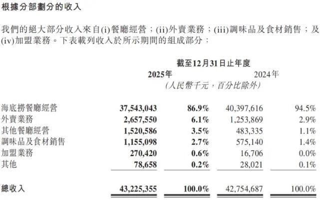 值得注意的是,海底撈的核心板塊餐廳經(jīng)營業(yè)務(wù)出現(xiàn)增長瓶頸。財報顯示,海底撈餐廳經(jīng)營收入從2024年的403.98億元降至375.43億元,同比減少7.1%,占總營收比重也從94.5%收縮至86.9%。