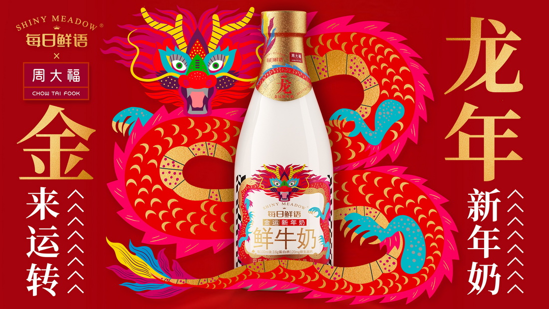 品牌跨界聯(lián)名,不斷活化品牌,帶來增益轉化。春節(jié)期間,每日鮮語攜手周大福,推出“金運新年奶”,開啟“龍來運轉”新一年,為消費者帶來“黃金”營養(yǎng)。