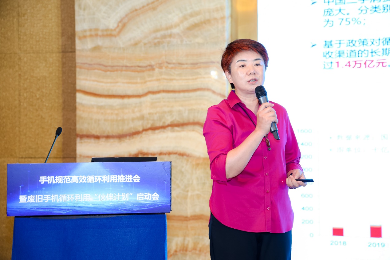 中國(guó)循環(huán)經(jīng)濟(jì)協(xié)會(huì)互聯(lián)網(wǎng)+資源循環(huán)利用專(zhuān)委會(huì)秘書(shū)長(zhǎng)侯允在會(huì)上發(fā)布廢舊手機(jī)循環(huán)利用團(tuán)體標(biāo)準(zhǔn)框架。(主辦方供圖)
