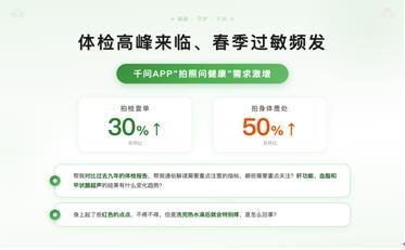 4月17日,來自千問APP的數(shù)據(jù)顯示,受體檢季和春季過敏高發(fā)疊加影響,用戶“拍照問健康”的行為明顯增加。其中,拍檢查單進(jìn)行解讀的需求月環(huán)比增長超過30%,而針對(duì)皮膚等癥狀的拍照咨詢需求增幅更高,超過50%。