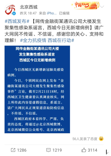 截至2月21日18時,經(jīng)西城區(qū)衛(wèi)生健康委認真調(diào)查核實,網(wǎng)上“金融街某通訊公司大樓發(fā)生聚集性感染”是虛假信息,系謠言。請廣大網(wǎng)民從正規(guī)渠道獲取防疫信息。