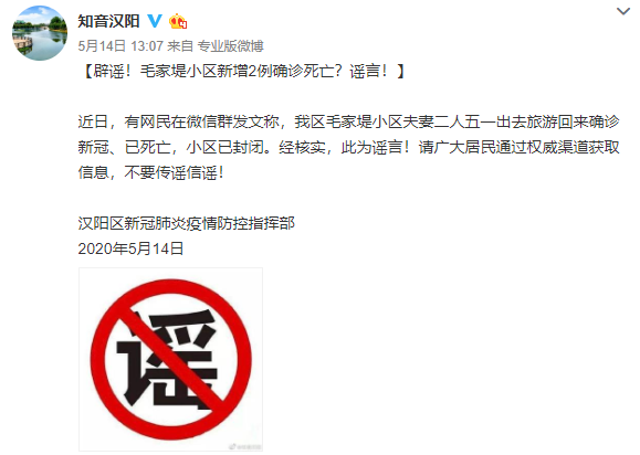 據(jù)武漢市漢陽區(qū)委宣傳部官方微博5月14日消息,武漢市漢陽區(qū)新冠肺炎疫情防控指揮部稱,經(jīng)核實(shí),網(wǎng)傳“漢陽區(qū)毛家堤小區(qū)一對夫妻五一出游后確診新冠肺炎,已死亡,小區(qū)已封閉?!钡刃畔⒕鶠橹{言。請廣大居民通過權(quán)威渠道獲取信息,不傳謠信謠。