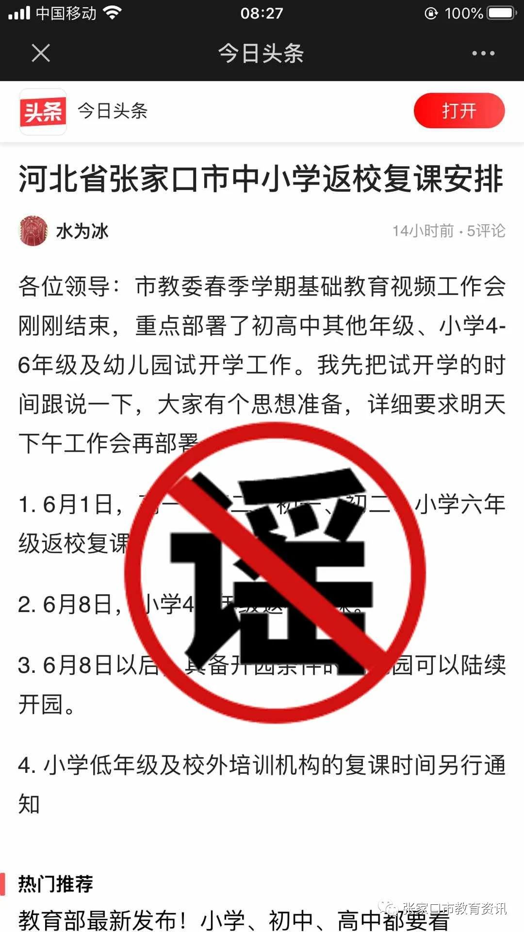 謠言粉碎機(jī)二:張家口發(fā)布中小學(xué)返校復(fù)課安排,6月8日幼兒園可開園?不實(shí)!