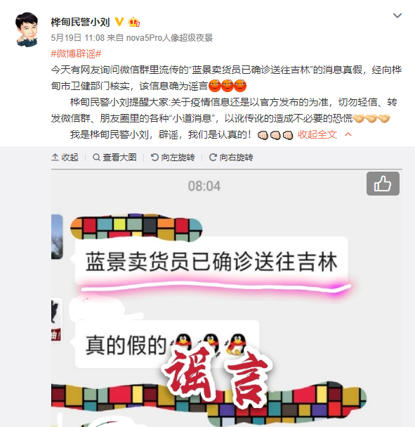 據(jù)吉林省樺甸市公安局永吉派出所民警劉剛 @樺甸民警小劉 5月19日消息,經(jīng)向樺甸市衛(wèi)健部門核實,網(wǎng)傳“藍景賣貨員已確診送往吉林”系謠言。