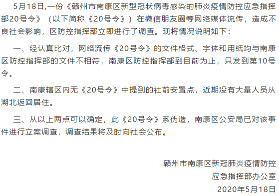 據(jù)中共贛州市南康區(qū)委宣傳部官微“南康發(fā)布”5月19日消息,贛州市南康區(qū)新冠肺炎疫情防控應(yīng)急指揮部辦公室稱,5月18日,一份《贛州市南康區(qū)新型冠狀病毒感染的肺炎疫情防控應(yīng)急指揮部20號令》(以下簡稱《20號令》)在微信朋友圈等網(wǎng)絡(luò)媒體流傳,造成不良社會影響,南康區(qū)防控指揮部立即進(jìn)行了調(diào)查。現(xiàn)將情況說明如下: