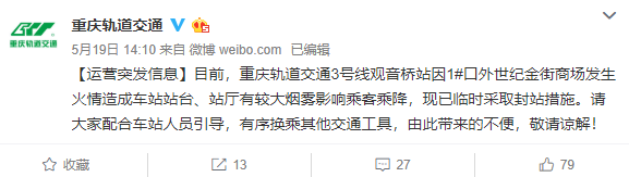 近日,有消息稱因出現(xiàn)疑似病例,重慶軌道交通3號線觀音橋站被封。對此,5月19日14時(shí),重慶市軌道交通(集團(tuán))有限公司@重慶軌道交通回應(yīng)稱,目前,重慶軌道交通3號線觀音橋站因1#口外世紀(jì)金街商場發(fā)生火情造成車站站臺、站廳有較大煙霧影響乘客乘降,現(xiàn)已臨時(shí)采取封站措施。????