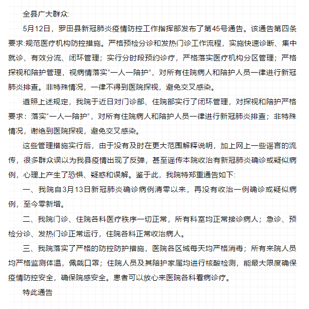 針對近日湖北羅田縣人民醫(yī)院收治新冠肺炎確診病例等傳言,5月22日,羅田縣人民醫(yī)院發(fā)布《關(guān)于本院疫情防控和醫(yī)療秩序一切正常的通告》辟謠稱,該院自3月13日新冠肺炎確診病例清零以來,再沒有收治一例確診或疑似病例,至今零新增。目前,該院門診、住院各科醫(yī)療秩序一切正常,所有科室均正常接診病人;急診、預(yù)檢分診、發(fā)熱門診正常運行,住院各科正常收治病人。