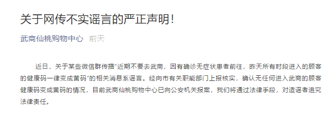 據(jù)武商仙桃購物中心管理有限公司官微5月23日消息,近日,關(guān)于某些微信群傳播“近期不要去武商,因有確診無癥狀患者前往,昨天所有時段進入的顧客的健康碼一律變成黃碼”的相關(guān)消息系謠言。經(jīng)向市有關(guān)職能部門上報核實,確認(rèn)無任何進入武商的顧客健康碼變成黃碼的情況,目前武商仙桃購物中心已向公安機關(guān)報案,將通過法律手段,對造謠者追究法律責(zé)任。