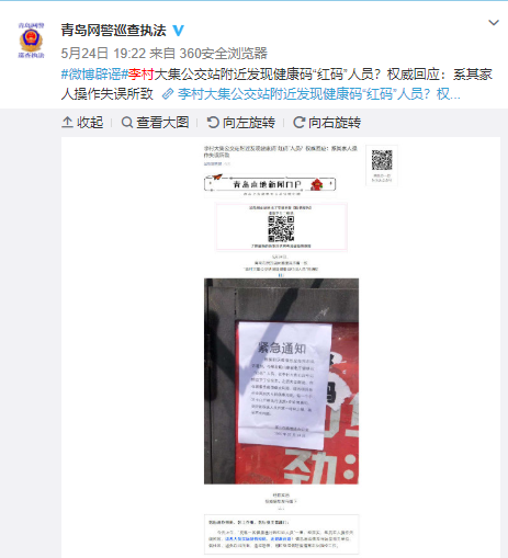 據(jù)半島都市報官微5月24日報道,針對“發(fā)現(xiàn)一名健康通行碼紅碼人員”一事,經(jīng)落實,系其家人操作失誤所致,該名人員實際持有綠碼,無健康問題。此外,5月24日,山東省青島市公安局網(wǎng)絡(luò)警察支隊官方微博也對此傳言進行了辟謠。