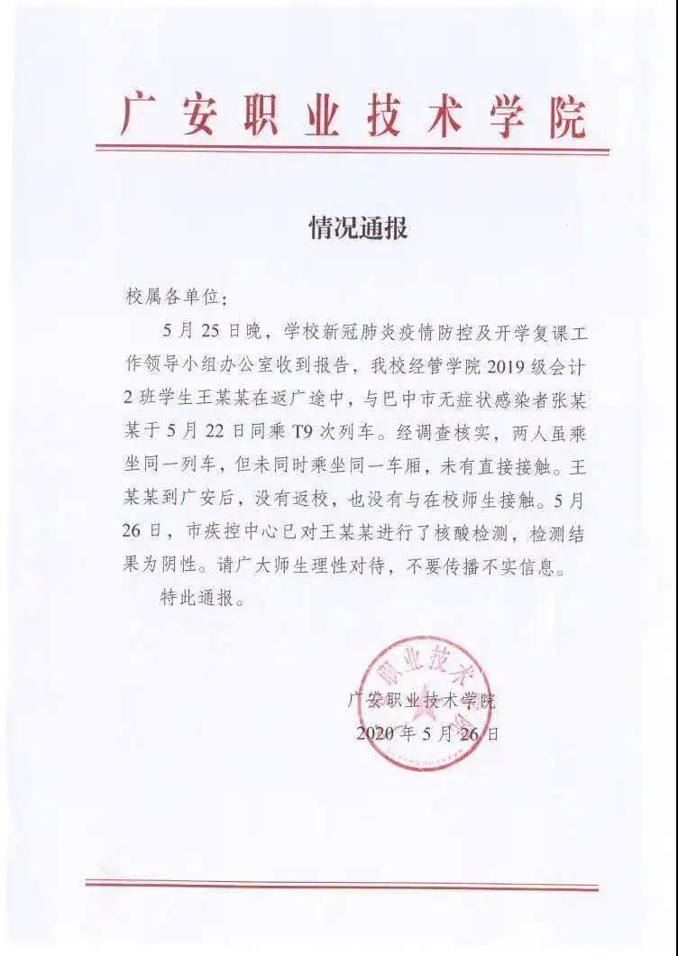 公告稱, 5月25日晚,廣安職業(yè)技術(shù)學(xué)院新冠肺炎疫情防控及開學(xué)復(fù)課工作領(lǐng)導(dǎo)小組辦公室收到報告,該校經(jīng)管學(xué)院2019級會計(jì)2班學(xué)生王某某在返廣(安)途中,與巴中市無癥狀感染者張某某于5月22日同乘T9次列車。經(jīng)調(diào)查核實(shí),兩人雖乘坐同一列車,但未同時乘坐同一車廂,未有直接接觸。王某某到廣安后,沒有返校,也沒有與在校師生接觸。5月26日,廣安市疾控中心對王某某進(jìn)行核酸檢測,檢測結(jié)果為陰性。