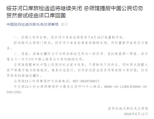 對(duì)此,6月12日,中國駐符拉迪沃斯托克總領(lǐng)事館辟謠稱,經(jīng)向國內(nèi)主管部門核實(shí),綏芬河口岸旅檢通道將繼續(xù)關(guān)閉,何時(shí)重新開放將另行通告。目前,濱海邊疆區(qū)與中方間波格拉尼奇內(nèi)—綏芬河、克拉斯基諾—琿春、波爾塔夫卡—東寧3對(duì)中俄公路客運(yùn)口岸均繼續(xù)關(guān)閉。