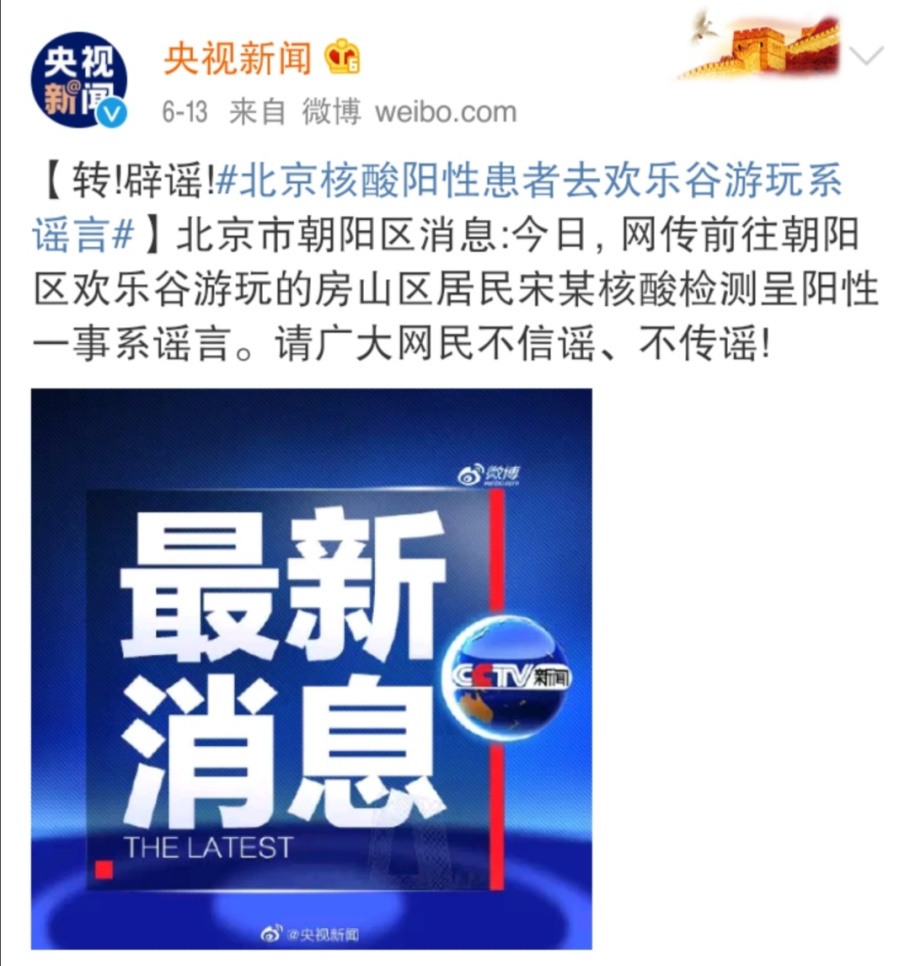 另據(jù)@央視新聞,針對(duì)“家住房山區(qū)的宋某在歡樂谷游玩時(shí)發(fā)現(xiàn)自己核酸檢測(cè)結(jié)果呈陽性”一事,北京市朝陽區(qū)對(duì)此表示,該信息是謠言。
