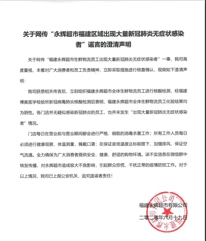 經(jīng)濟(jì)日?qǐng)?bào)-中國(guó)經(jīng)濟(jì)網(wǎng)6月23日訊(記者朱國(guó)旺 郭文培) 6月19日,就“福建永輝超市生鮮物流員工出現(xiàn)大量新冠肺炎無(wú)癥狀感染者”一事,福建永輝超市有限公司聲明稱,獲悉相關(guān)傳言后,立刻組織福建永輝超市全體生鮮物流員工進(jìn)行核酸檢測(cè),福建永輝超市全體生鮮物流員工化驗(yàn)結(jié)果均為陰性。各門(mén)店并無(wú)疑似感染新冠肺炎的員工,也并未發(fā)生“出現(xiàn)大量新冠肺炎無(wú)癥狀感染者”情況。