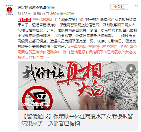 6月22日,保定市公安局網(wǎng)絡(luò)安全保衛(wèi)支隊(duì)發(fā)布警情通報(bào)稱,網(wǎng)傳“河北省保定市順平縣一帶魚(yú)老板店去北京新發(fā)地進(jìn)魚(yú)被隔離”等信息為謠言。經(jīng)過(guò)市縣兩級(jí)網(wǎng)安部門(mén)調(diào)查,造謠人翟某某已被順平公安機(jī)關(guān)依法行政拘留。