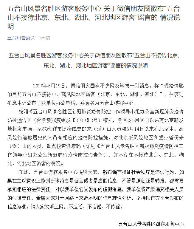 6月20日,五臺(tái)山風(fēng)景名勝區(qū)游客服務(wù)中心辟謠稱,“五臺(tái)山不接待北京、東北、湖北、河北地區(qū)游客”的說(shuō)法為謠言。