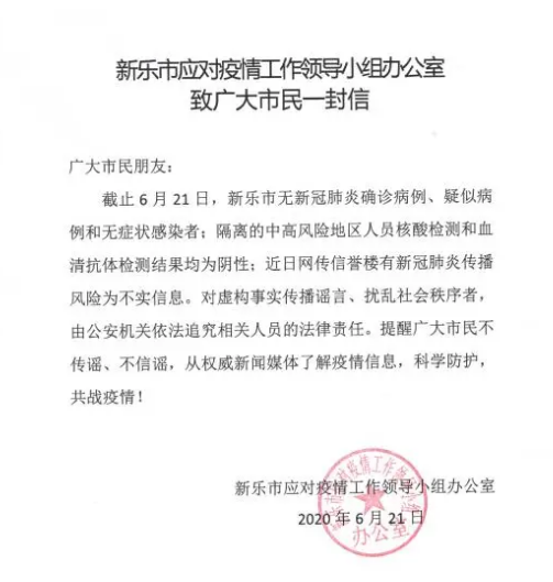 據(jù)河北省新樂(lè)市宣傳部官微21日消息,新樂(lè)市信譽(yù)樓有新冠肺炎傳播風(fēng)險(xiǎn)為不實(shí)信息。截止6月21日,新樂(lè)市無(wú)新冠肺炎確診病例、疑似病例和無(wú)癥狀感染者;隔離的中高風(fēng)險(xiǎn)地區(qū)人員核酸檢測(cè)和血清抗體檢測(cè)結(jié)果均為陰性。
