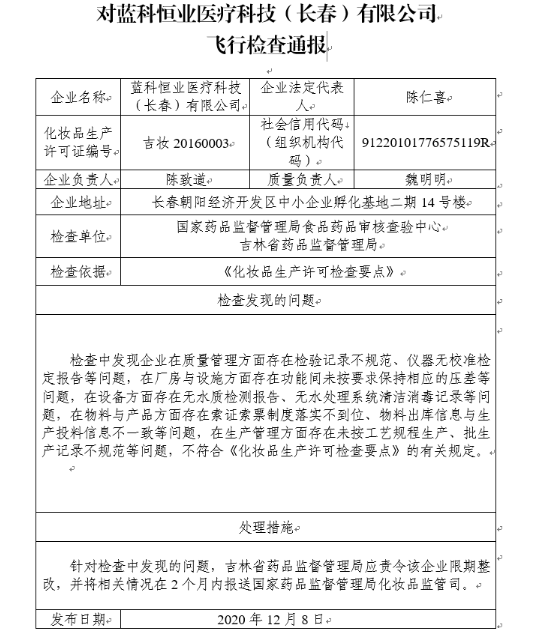 針對(duì)檢查中發(fā)現(xiàn)的問題,國家藥監(jiān)局要求吉林省藥品監(jiān)督管理局應(yīng)責(zé)令該企業(yè)限期整改,并將相關(guān)情況在2個(gè)月內(nèi)報(bào)送國家藥品監(jiān)督管理局化妝品監(jiān)管司。