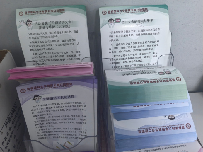 記者走進北京口腔醫(yī)院門診樓,綠色的“老年咨詢臺”標示映入眼簾。老年咨詢臺正前方走20米,左手邊便是老年口腔病科。順著黃色地標徑直走約30米,便到達分診臺。上午的分診臺前,是患者最多的時候,詢問聲和指引聲交織,忙而有序。分診臺一角的老花鏡和大字版宣教彩頁引人矚目。護士告訴記者,這是為老年患者特意準備的?!翱剖医ǖ臅r間長,我們也準備搬新院了,雖然地方有點局促,但該有的硬件都有?!?/p>