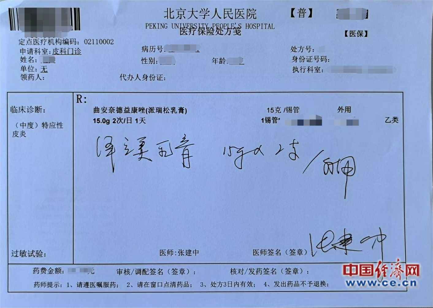 圖為北京大學(xué)人民醫(yī)院皮膚科張建中教授為患者開出首張?zhí)幏?中國經(jīng)濟(jì)網(wǎng)裴小閣攝