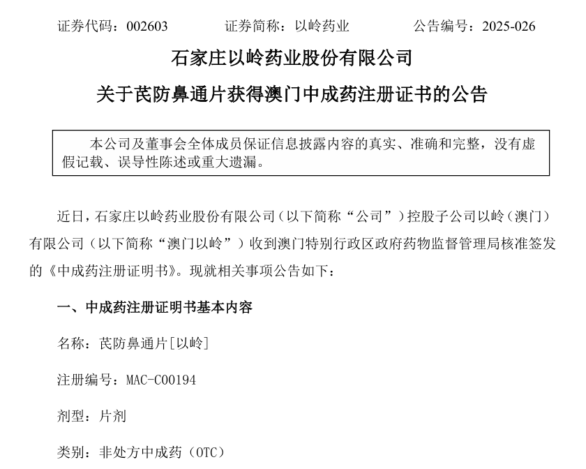 7月11日晚,以嶺藥業(yè)發(fā)布公告稱,該公司控股子公司以嶺(澳門)有限公司收到澳門特別行政區(qū)政府藥物監(jiān)督管理局(以下簡稱“澳門藥監(jiān)局”)核準簽發(fā)的《中成藥注冊證明書》。