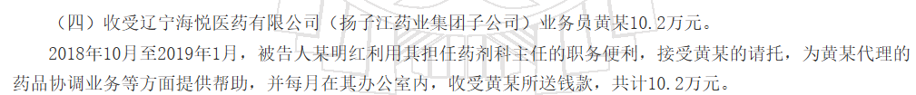 根據(jù)判決書,2018年10月至2019年1月,被告人某明紅利用其擔任藥劑科主任的職務(wù)便利,接受遼寧海悅醫(yī)藥有限公司(揚子江藥業(yè)集團子公司)業(yè)務(wù)員黃某的請托,為黃某代理的藥品協(xié)調(diào)業(yè)務(wù)等方面提供幫助,并每月在其辦公室內(nèi),收受黃某所送錢款,共計10.2萬元。