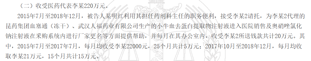 根據(jù)判決書,20157月至201812月,被告人某明紅利用其擔(dān)任藥劑科主任的職務(wù)便利,接受“李某2”請(qǐng)托,為“李某2”代理的昆藥集團(tuán)血塞通(凍干)、武漢人福藥業(yè)有限公司生產(chǎn)的小牛血去蛋白提取物注射液進(jìn)入醫(yī)院銷售及奧硝唑氯化鈉注射液在釆購(gòu)系統(tǒng)內(nèi)進(jìn)行廠家更名等方面提供幫助,并每月在其辦公室內(nèi),收受“李某2”所送錢款共計(jì)20萬(wàn)元。