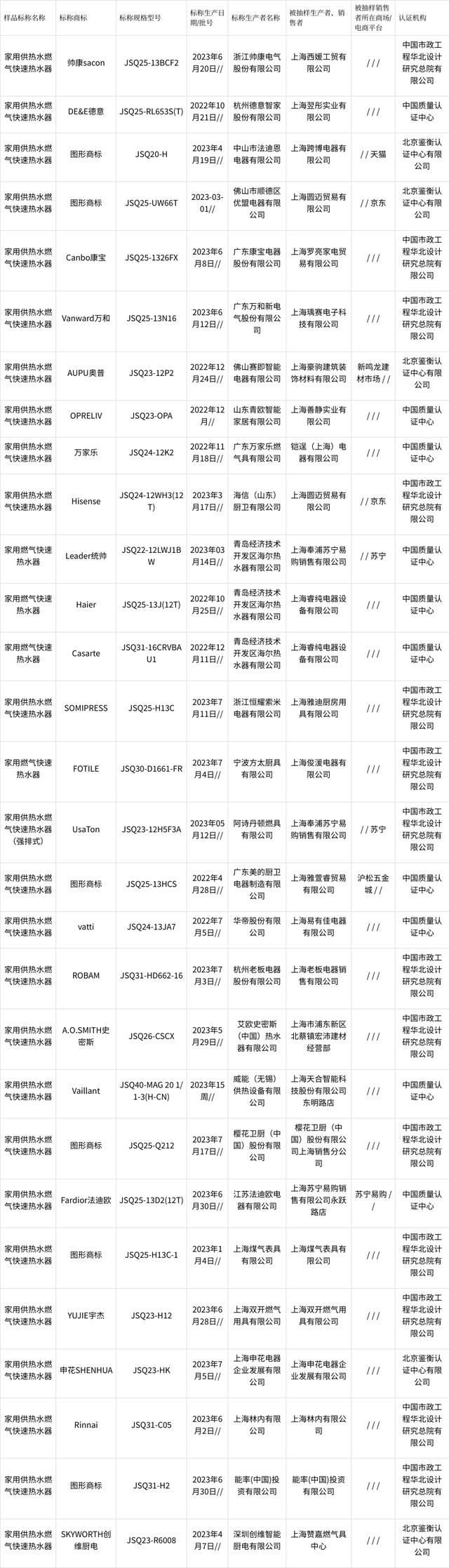 2023年上海市家用燃氣快速熱水器產品質量監(jiān)督抽查所檢項目符合相關標準的產品